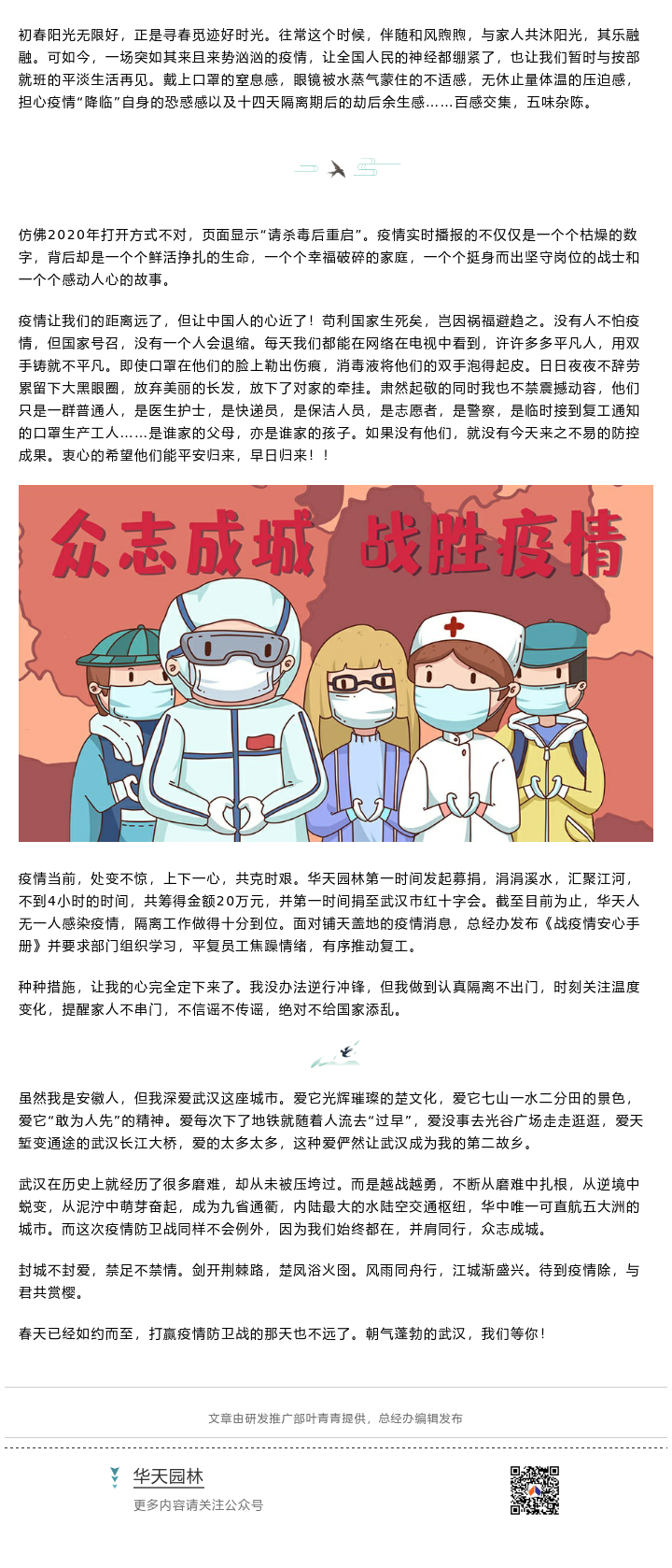 【概要描述】初春陽光無限好,正是尋春覓跡好時光。往常這個時候,伴隨和風煦煦,與家人共沐陽光,其樂融融??扇缃?,一場突如其來且來勢洶洶的疫情,讓全國人民的神經(jīng)都繃緊了,也讓我們暫時與按部就班的平淡生活再見。戴上口罩的窒息感,眼鏡被水蒸氣蒙住的不適感,無休止量體溫的壓迫感,擔心疫情“降臨”自身的恐惑感以及十四天隔離期后的劫后余生感……百感交集,五味雜陳。