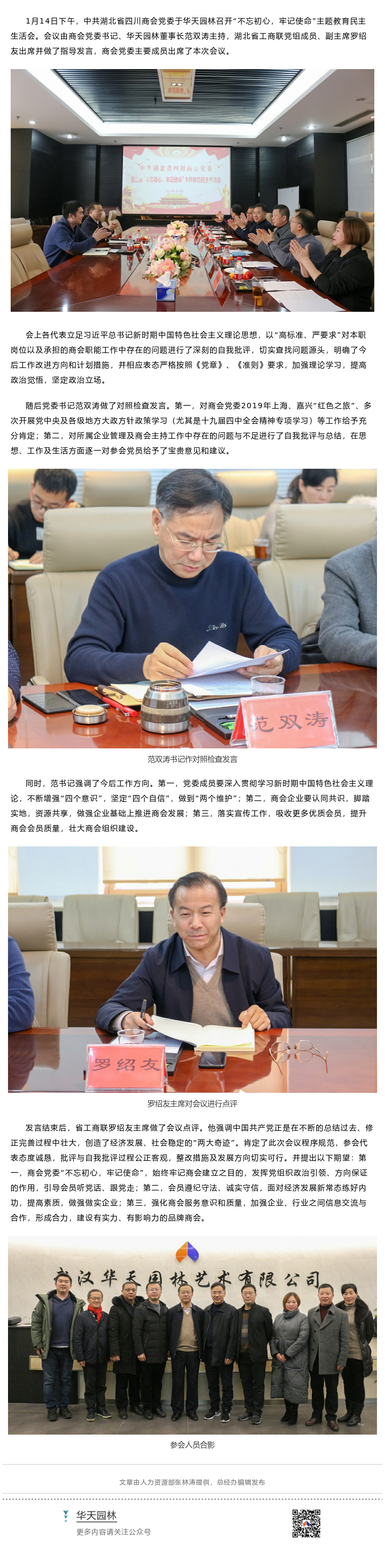 【概要描述】2020年1月14日,中共湖北省四川商會黨委于華天園林召開“不忘初心,牢記使命”主題教育民主生活會。會議由商會黨委書記、華天園林董事長范雙濤主持, 湖北省工商聯黨組成員、副主席羅紹友出席并做了指導發(fā)言,商會黨委主要成員出席了本次會議。