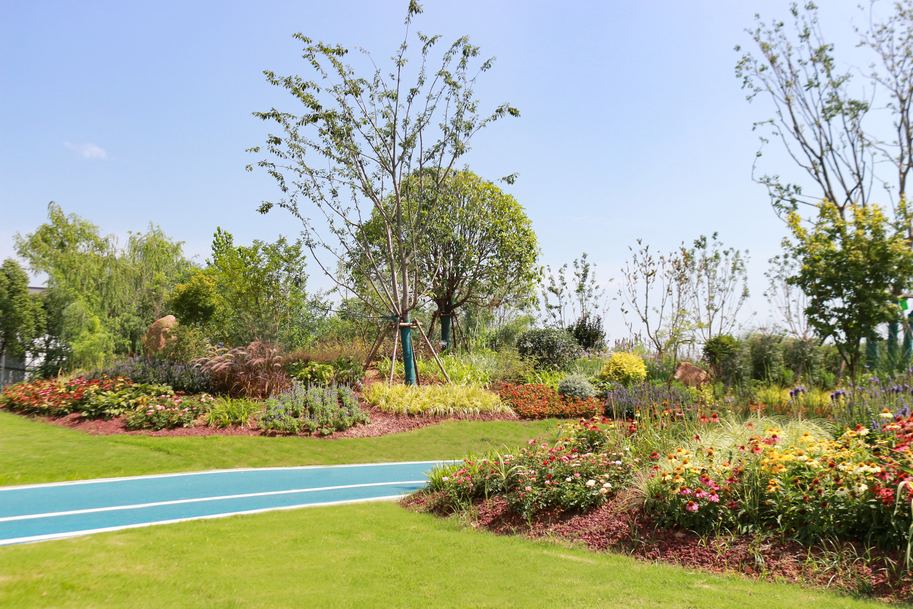 高新大道全長約為9公里,景觀建設(shè)總用地約為40公頃,兩側(cè)的綠化帶寬約20-40米,其中綠化用地約為34公頃。我們就工程質(zhì)量、安全文明等措施,多措并舉地提出了“對標(biāo)北京長安街,打造武漢的長安街”的目標(biāo)。項目建設(shè)內(nèi)容包含主干道道路綠化、道路拓展綠化、生態(tài)步道及道路沿線生態(tài)修復(fù)等。項目的建設(shè)將有效提升城市形象、改善人居環(huán)境,運(yùn)用“生態(tài)、和諧、自然、低碳、智慧”的設(shè)計理念,打造一條具有國際標(biāo)準(zhǔn)的道路景觀,展示先進(jìn)的建設(shè)理念、創(chuàng)造綠色宜人的人文環(huán)境。
