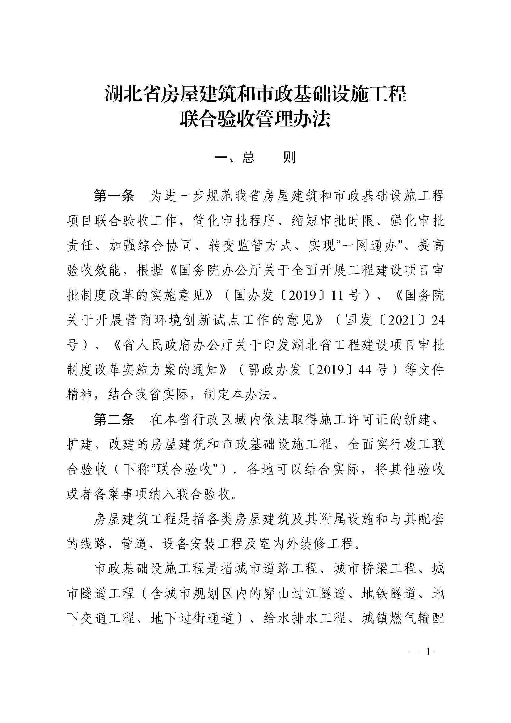 【概要描述】為進(jìn)一步規(guī)范我省房屋建筑和市政基礎(chǔ)設(shè)施工程項(xiàng)目聯(lián)合驗(yàn)收工作,簡(jiǎn)化審批程序、縮短審批時(shí)限、強(qiáng)化審批責(zé)任、加強(qiáng)綜合協(xié)同、轉(zhuǎn)變監(jiān)管方式、實(shí)現(xiàn)“一網(wǎng)通辦”、提高驗(yàn)收效能,根據(jù)《國(guó)務(wù)院辦公廳關(guān)于全面開(kāi)展工程建設(shè)項(xiàng)目審批制度改革的實(shí)施意見(jiàn)》(國(guó)辦發(fā)〔2019〕11 號(hào))、《國(guó)務(wù)院關(guān)于開(kāi)展?fàn)I商環(huán)境創(chuàng)新試點(diǎn)工作的意見(jiàn)》(國(guó)發(fā)〔2021〕24號(hào))、《省人民政府辦公廳關(guān)于印發(fā)湖北省工程建設(shè)項(xiàng)目審批制度改革實(shí)施方案的通知》(鄂政辦發(fā)〔2019〕44 號(hào))等文件精神,結(jié)合我省實(shí)際,制定本辦法。
