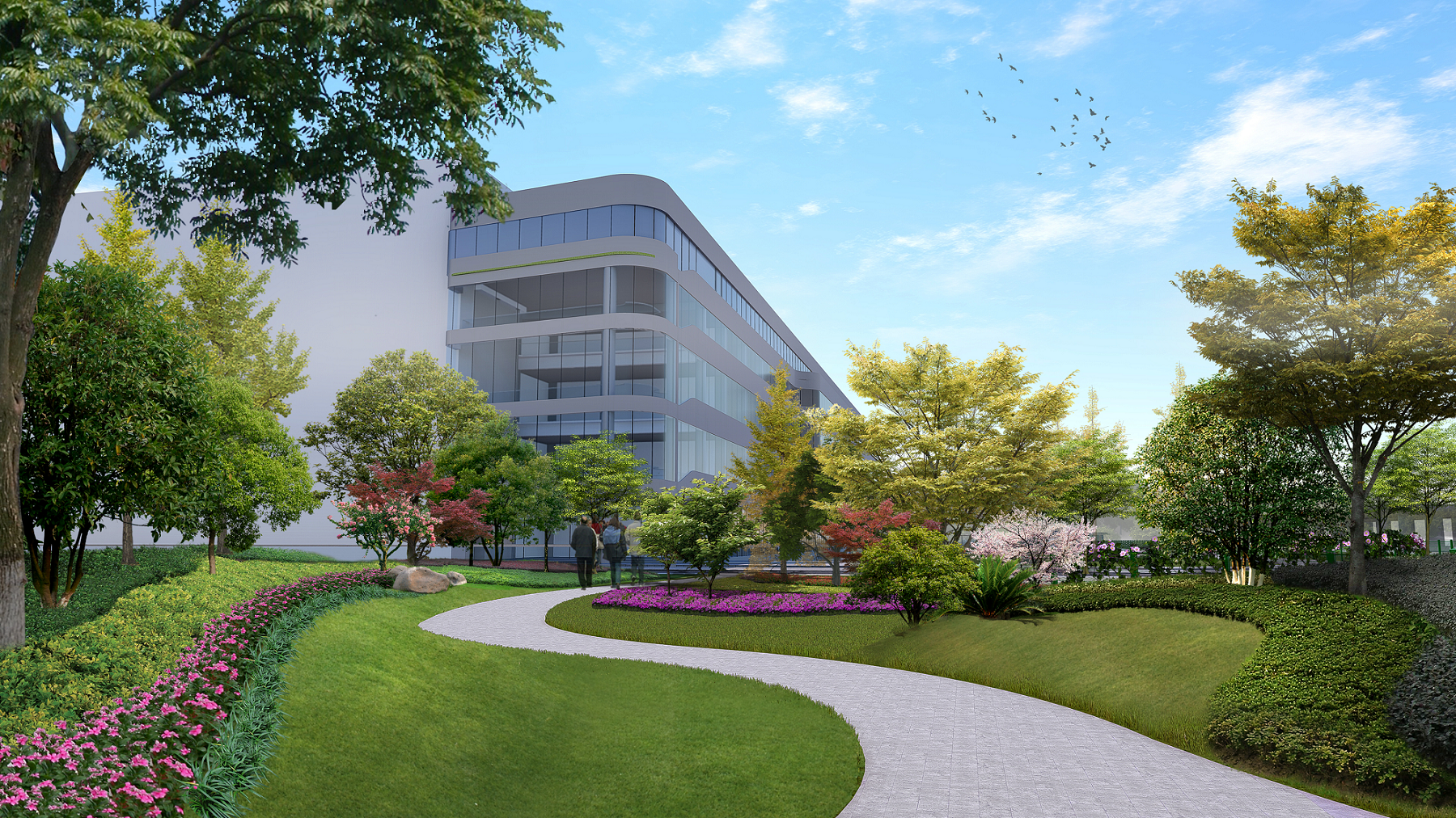 在植物配置上,華星光電作為合資企業(yè),T3員工有不少日本人,因此樹種選用開花美到極致的櫻花,T4員工不少韓國人,因此選用武漢與韓國都比較常見的櫸樹,體現(xiàn)對員工的人文關懷。廣場前的紅楓則與T3廣場前紅楓遙相呼應,盡管T3、T4時隔兩年的設計與施工,最終因為這一片紅融入到一起。